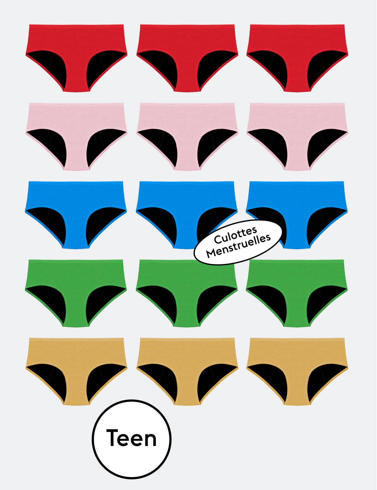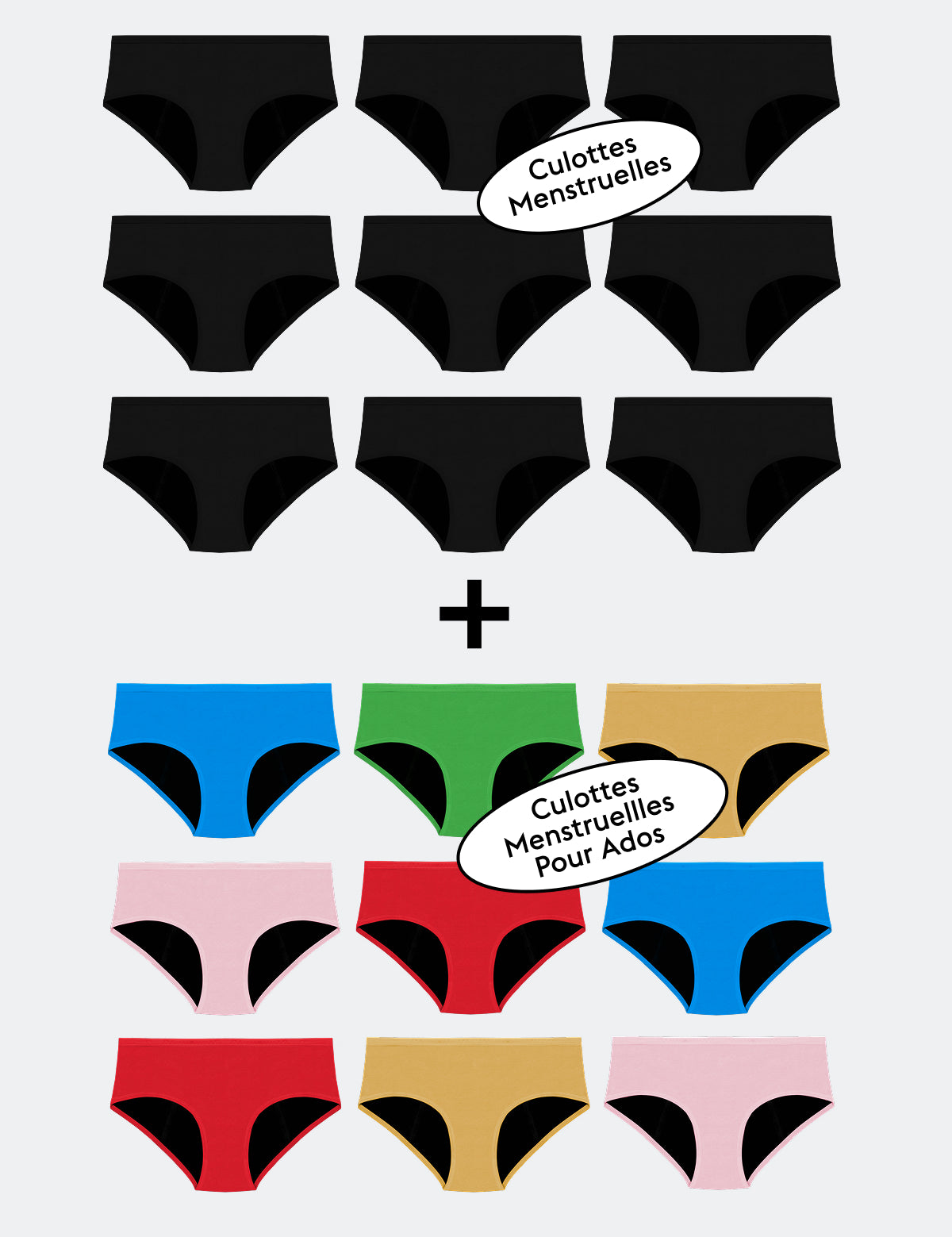 9 Culottes Menstruelles Noires 2 Culottes Menstruelles Ados Bleues 1 Culotte Menstruelle Ado Rose 1 Culotte Menstruelle Ado Rouge 1 Culotte Menstruelle Ado Verte 1 Culotte Menstruelle Ado Jaune