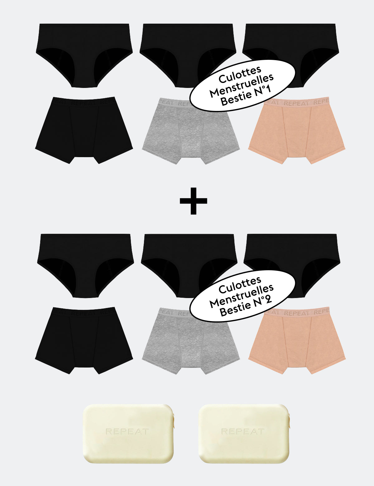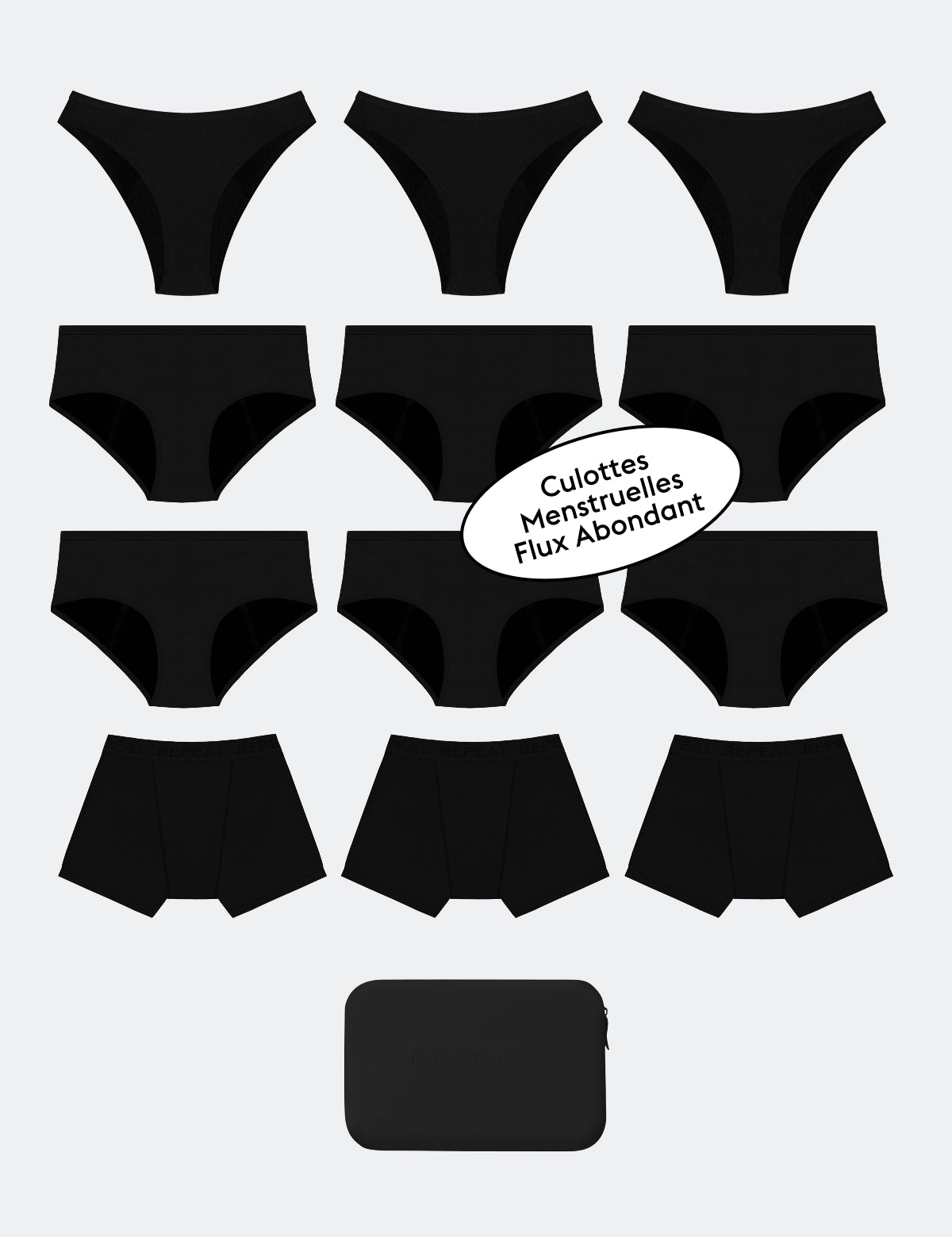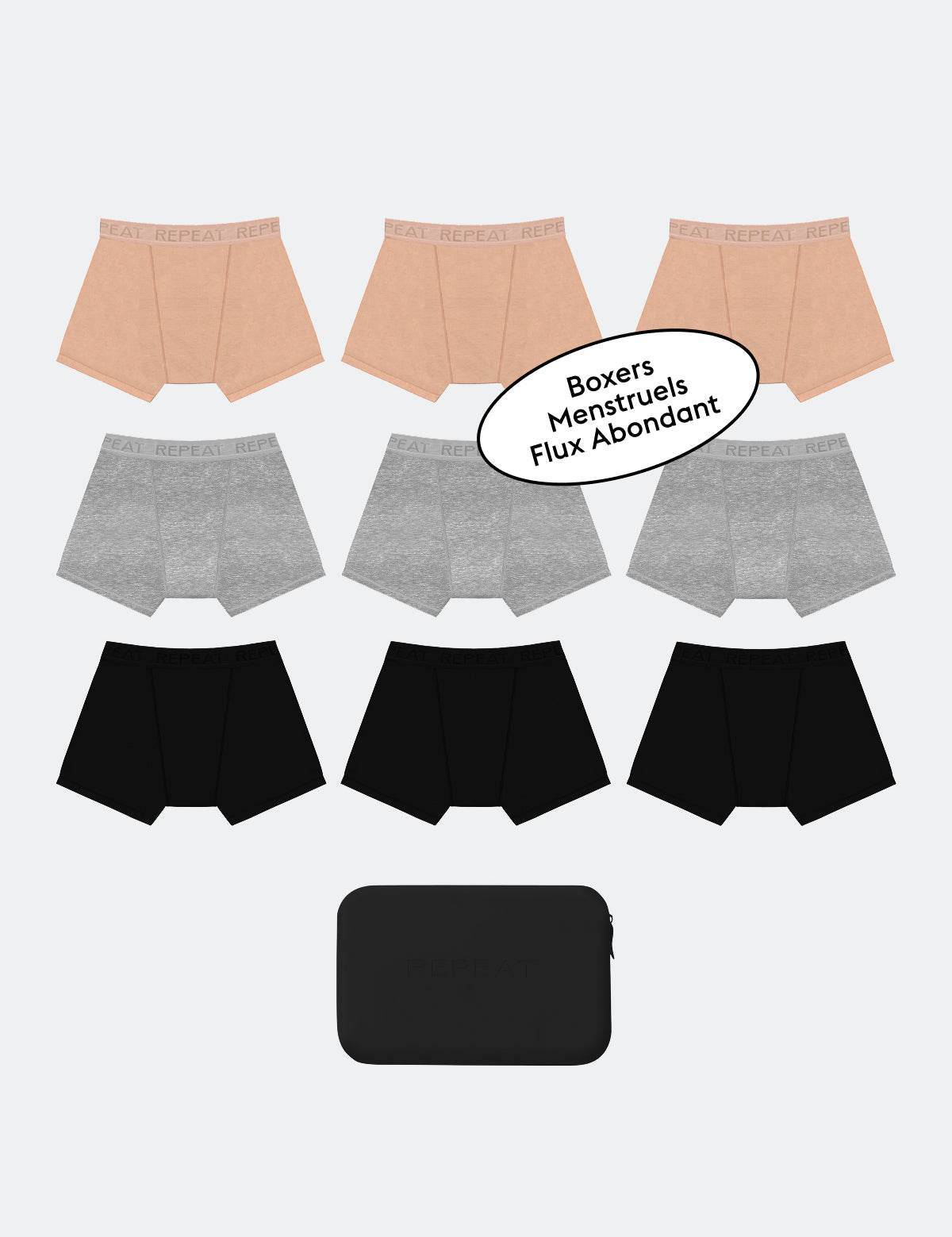6 Culottes Menstruelles REPEAT Noires 2 Boxers Menstruels REPEAT Noirs 2 Boxers Menstruels REPEAT Gris 2 Boxers Menstruels REPEAT Beiges 2 Pochettes de transport étanche beige