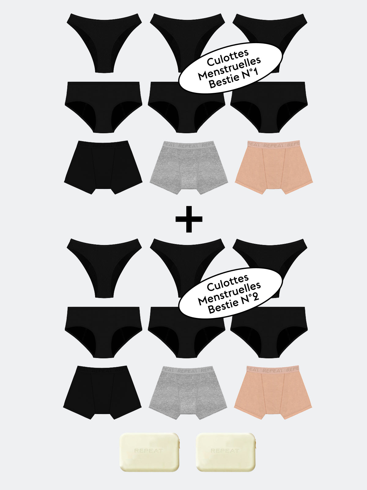Soeurs, meilleures potes ou duo de choc : Le Mega Pack Besties est un coffret inédit pour deux personnes, comprenant en tout 6 Culottes Menstruelles REPEAT Noires, 6 REPEAT 90, 6 Boxers Menstruels de chaque couleur de la collection, Noir, Gris et Beige, ainsi que 2 REPEAT Pocket beige étanches offertes pour un prix aussi désirable qu'imbattable.