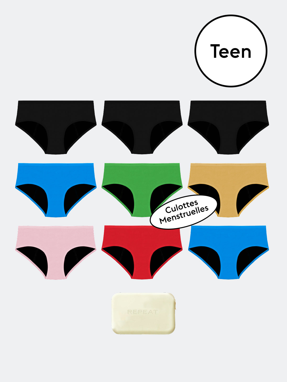 Pour Black Friday, nous avons créé Le Pack Découverte Teen : un premier pack complet comprenant 9 Culottes Menstruelles pour Ados de la gamme REPEAT Teen dans ses plus belles couleurs : Noir, Rouge, Rose, Bleu, Vert et Jaune, pour des règles joyeusement à l'abri des fuites. Sans oublier la pochette de rangement étanche REPEAT Pocket Beige offerte.