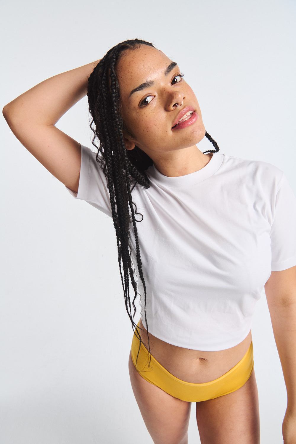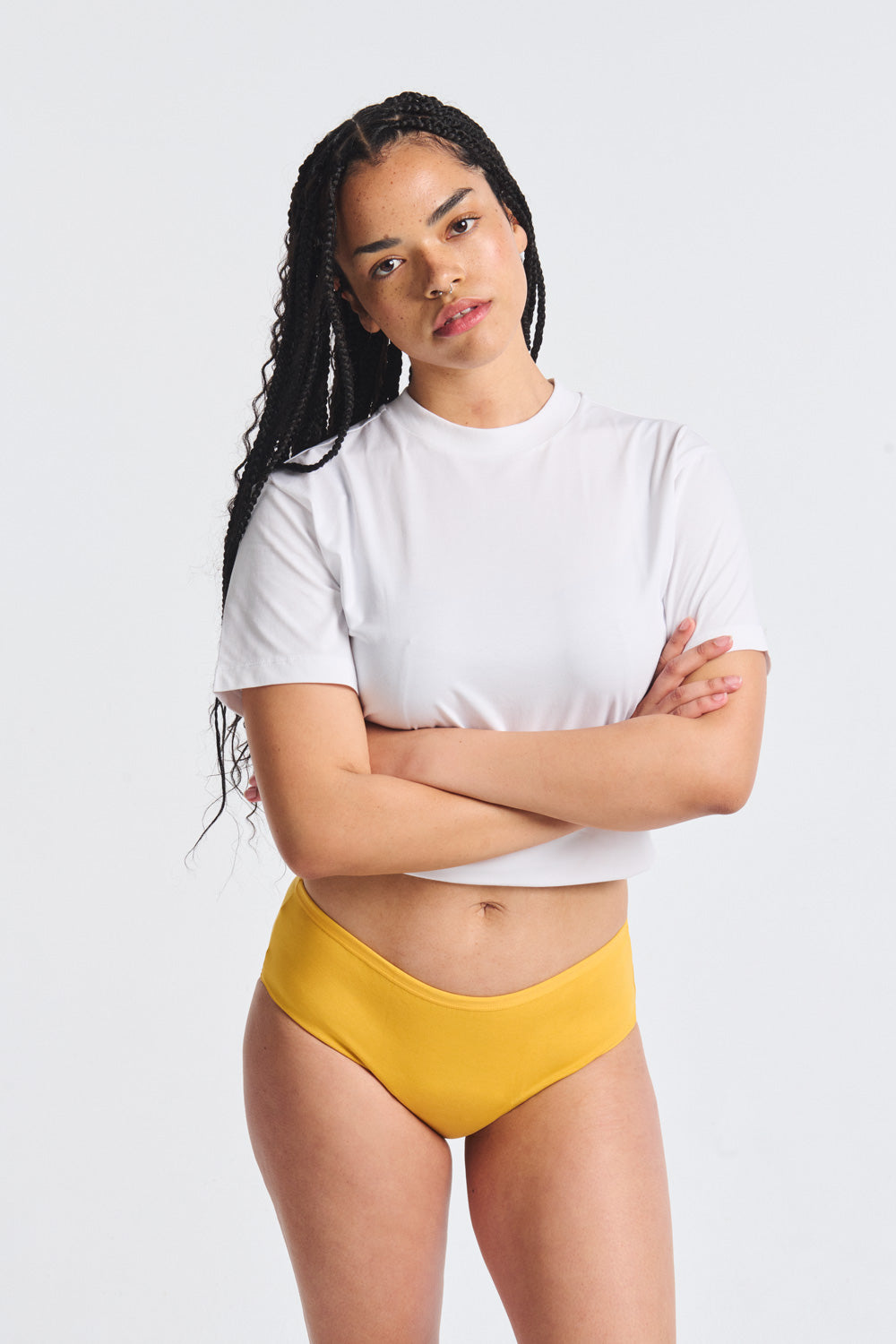 REPEAT décline sa célèbre culotte menstruelle noire tous flux pour ado en un nouveau jaune généreux pour offrir la solution efficace, confortable et stylée que votre ado mérite pendant ses règles.