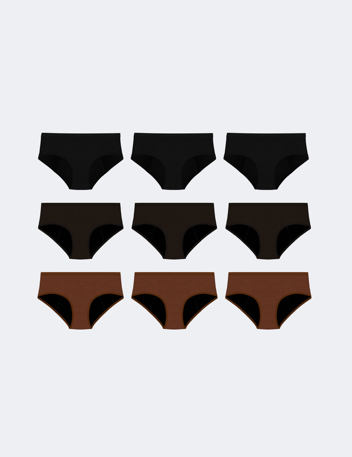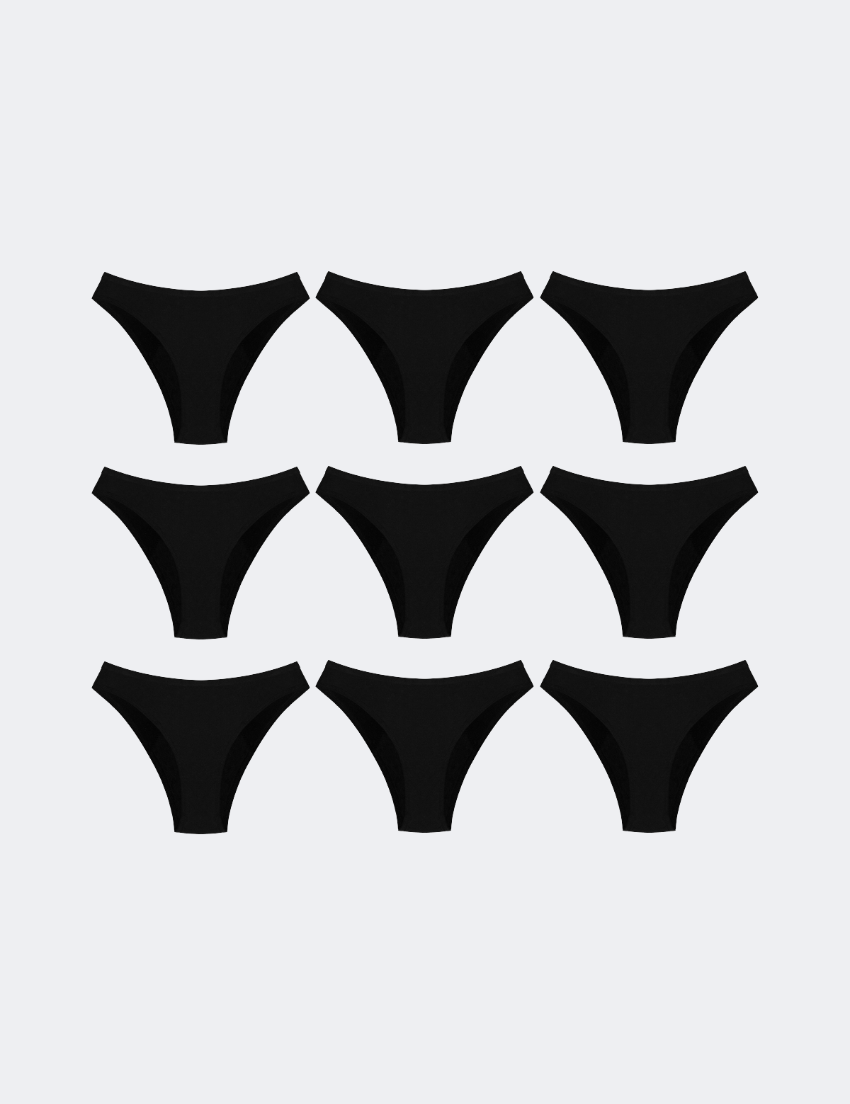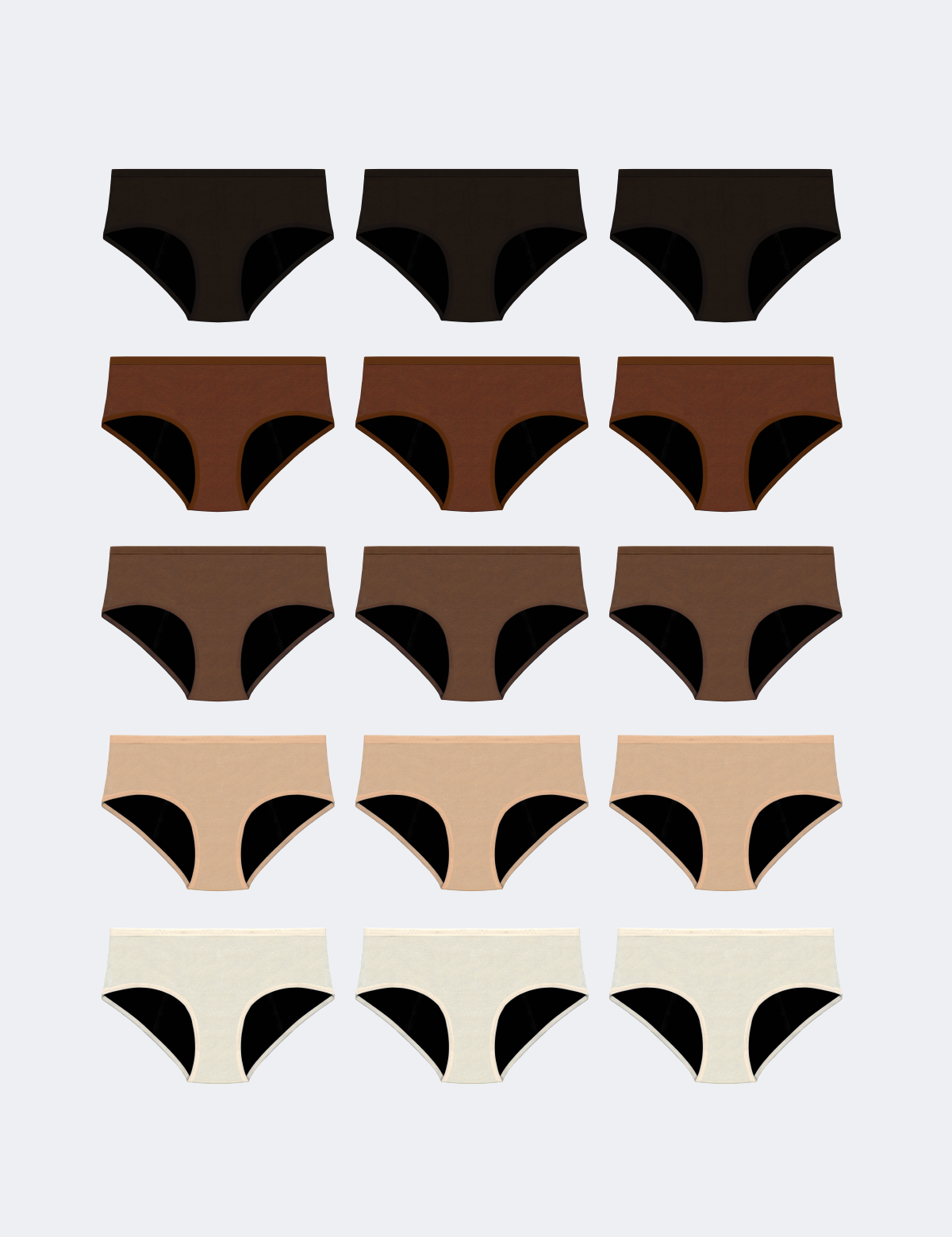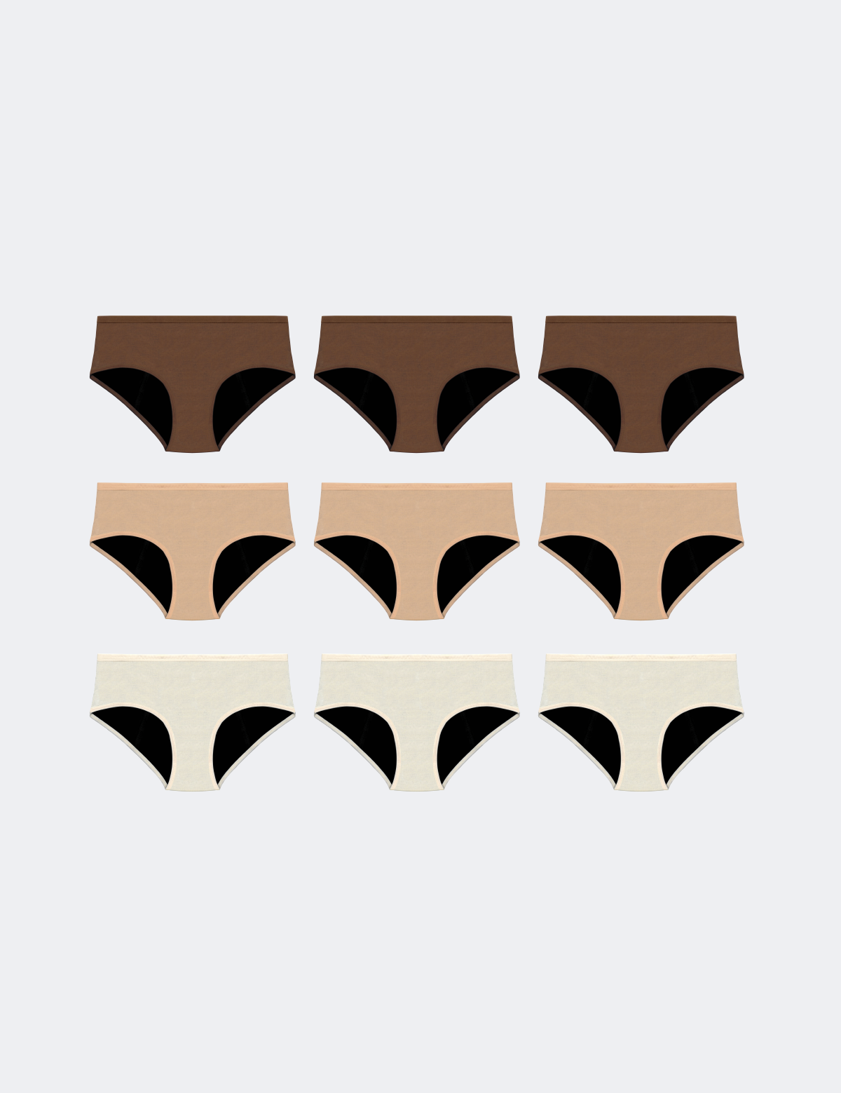 Selon ton flux et ton utilisation, nous te suggérons 6 à 9 culottes pour assurer une rotation entre les utilisations et les lavages. Si tu envisages de les utiliser pendant tout ton cycle et avoir un roulement parfait, nous recommandons d'avoir 9 culottes pour gérer facilement l'entretien.