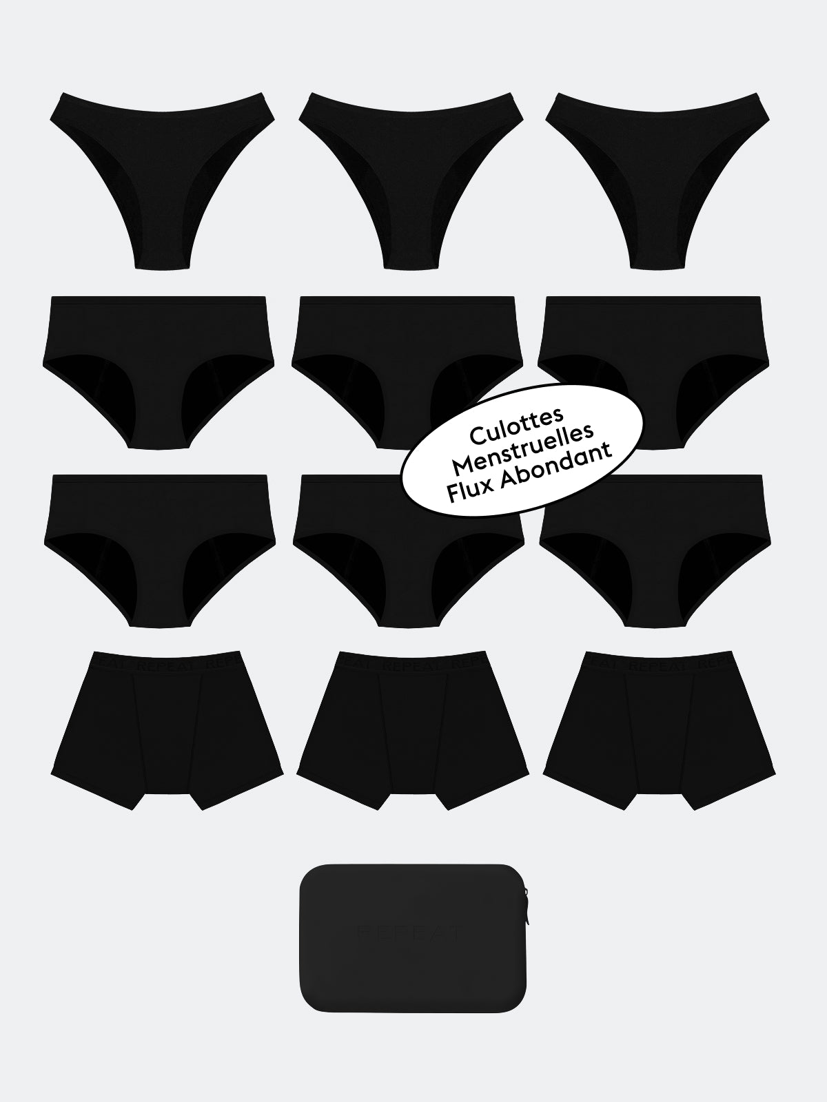 Pour Black Friday avons créé Le Mega Pack Noir : un pack inédit comprenant 6 Culottes Menstruelles REPEAT, 3 Culottes Menstruelles REPEAT 90, 3 REPEAT Boxers Noirs et la nouvelle REPEAT Pocket noire en grand format offerte pour un prix imbattable.